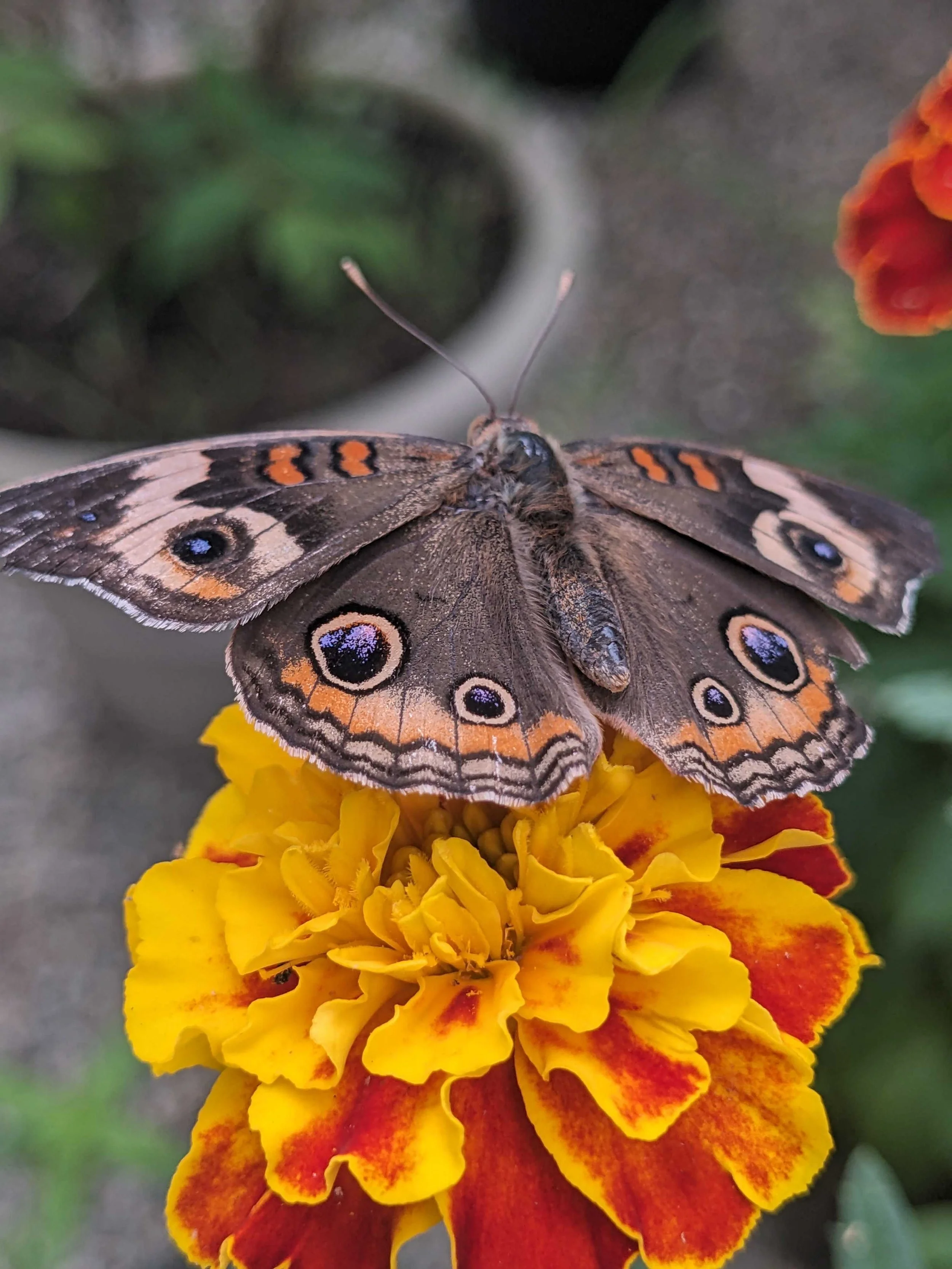Look at those spots? Do they look like eyes? The “fake eyes” on the Common Buckeye are meant to trick predators into thinking it is a bigger animal! The eye spots have hints of beautiful bright colors!
